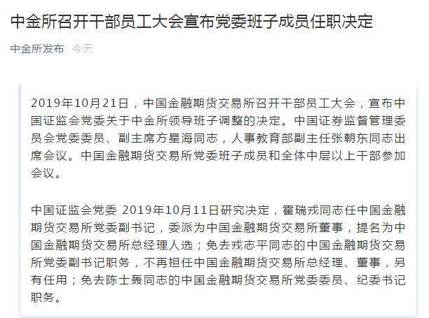 昨日傍晚,中金所官微发布消息,21日召开干部员工大会,宣布了中国证监会党委关于中金所领导班子调整的决定。中国证监会党委委员、副主席方星海,人事教育部副主任张朝东出席会议。中金所党委班子成员和全体中层以上干部参加会议。中国证监会党委 2019年10月11日研究决定,霍瑞戎任中金所党委副书记,委派为中金所董事,提名为中金所总经理人选;免去戎志平的中金所党委副书记职务,不再担任中金所总经理、董事,另有任用;免去陈士轰的中金所党委委员、纪委书记职务。