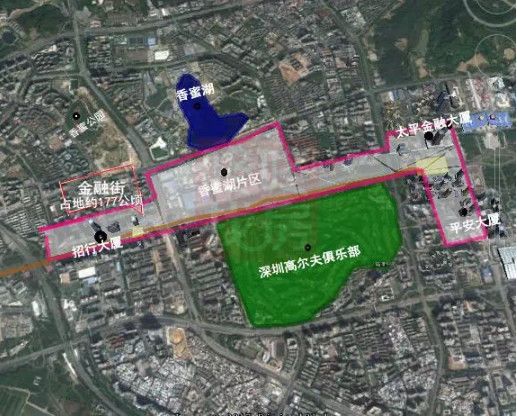 香蜜湖4.9平方公里的统筹更新,其定位为“深圳国际金融街+国际交流中心”,金融街区东起深交所营运中心、西至招商银行大厦,并延伸至香蜜湖,囊括了香蜜湖美食街和土地到期的深圳高尔夫球场。