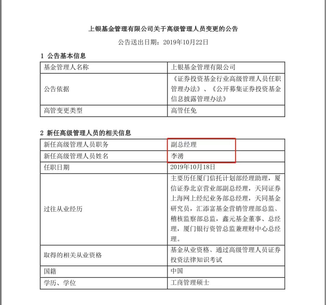 近日,上银基金发布关于高级管理人员变更的公告,聘任李湧担任公司副总经理一职。