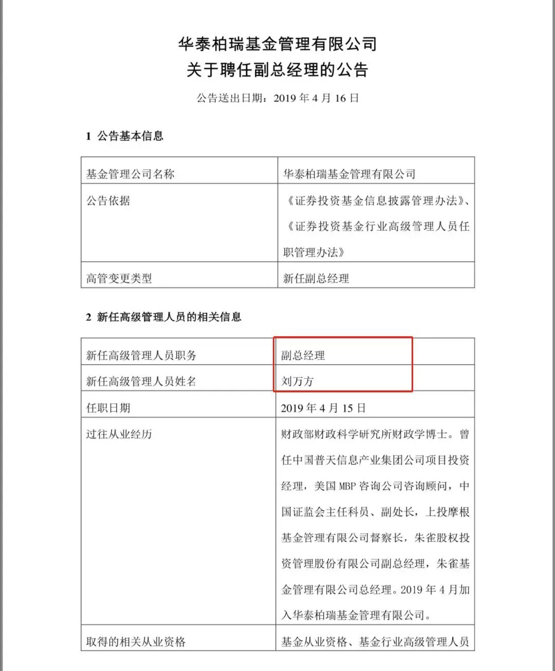 4月16日,华泰柏瑞基金公告称,刘万方将出任公司副总经理一职,