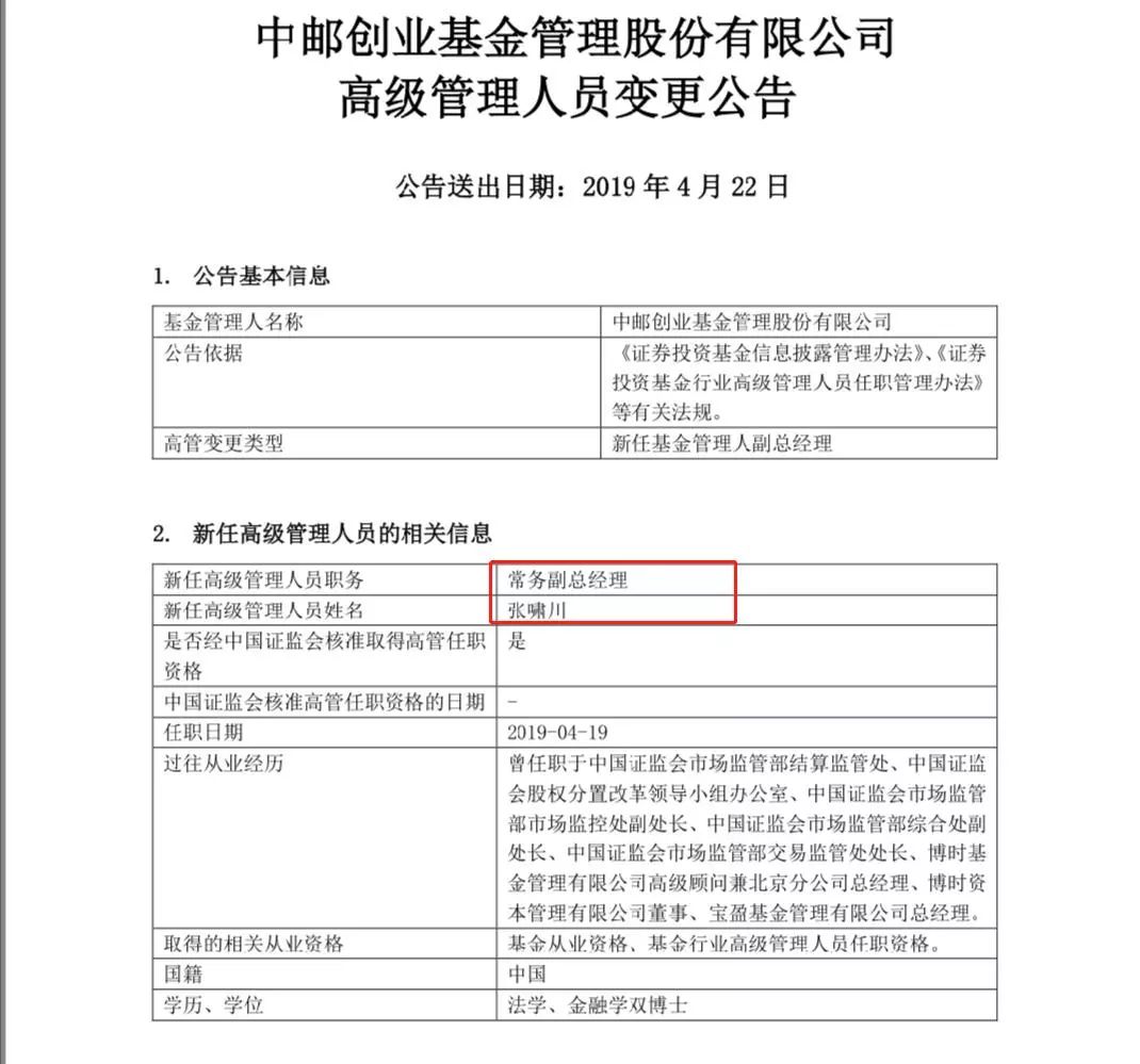 4 月 22 日,中邮基金也发布公告,新聘张啸川担任公司常务副总经理。张啸川曾任职于中国证监会市场监管部结算监管处、中国证监会股权分置改革领导小组办公室、中国证监会市场监管部市场监控处副处长、中国证监会市场监管部综合处副处长、中国证监会市场监管部交易监管处处长、博时基金管理有限公司高级顾问兼北京分公司总经理、博时资本管理有限公司董事、宝盈基金管理有限公司总经理。