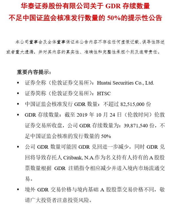 根据公告,截至10月24日(伦敦时间)伦交所收盘,华泰证券GDR存续数量为3987.15万份,不足证监会核准的发行数量的50%。华泰证券表示,公司GDR数量可能因兑回进一步减少,同时将导致存托人Citibank, N.A.作为名义持有人持有的A股股票数量,根据GDR注销指令相应减少并进入境内市场流通交易。