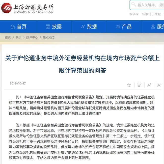 此外,据上交所10月17日消息,明确沪伦通业务中,境外证券经营机构在境内市场资产余额上限计算范围。其中,境外证券经营机构因接受客户委托开展沪伦通全球DR跨境兑回业务,而在境内市场持有的基础股票及对应现金,不纳入境内资产余额上限计算范围。此规定使GDR兑回不占用境内资产额度,有助于GDR兑回顺利进行,促进沪伦通业务发展。