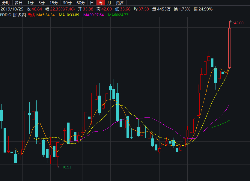 黄峥的财富增长,主要还是得益于拼多多上市后股价的出色表现。去年7月,拼多多登陆了纳斯达克,发行价为 19 美元,此后,股价便一直保持上升的态势。2019年8月,拼多多股价大涨,市值突破400亿美元,一举超过百度、小米和网易,成为中国第五大互联网公司。