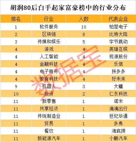 80后白手起家富豪榜中,排名前三的行业,分别为软件服务、区块链、传媒和娱乐,这三大行业占富豪榜排行榜四成多。