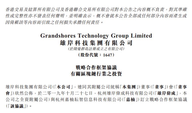 另一家港股上市公司雄岸科技(01647)公告称,附属雄岸伟成与嘉楠耘智签订战略合作框架协议,公司股价收盘0.51港币,涨18.6%。雄岸伟成拟在2020年12月31日前向嘉楠采购或代表嘉楠经销累计不超过1.5亿美元的区块链设备。资料显示,雄岸科技董事长姚勇杰是嘉楠耘智的天使轮投资人。