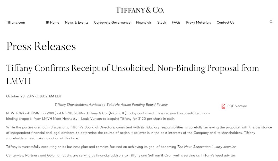随后美国东部时间28日早8点,Tiffany在官方网站证实,收到了来自LVMH的一份未经请求的非约束性要约,以每股120美元的价格现金收购蒂芙尼。