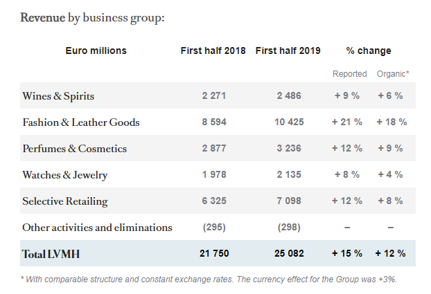 半年报显示,LVMH在2019年上半年实现收入250.82亿欧元,同比增长15%;经常性业务的利润为52.95亿欧元,增长14%;集团净利润32.68亿欧元,同比增长9%。亚洲、美国和欧洲市场增长强劲,尤其法国第二季度出现了反弹。