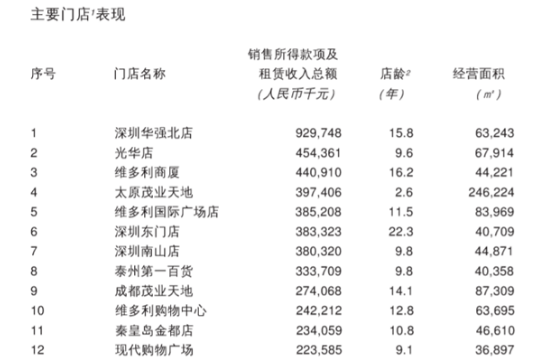 在香港上市的茂业国际曾在今年年初公布称,茂业百货等目标实体未达成2018年盈利保证。在今年上半年,茂业国际出现“增收不增利”的情况,期内公司经营收入总额为38.89亿元人民币,同比增长2.3%;净利润为4.22亿元人民币,同比减少17.1%。主要门店中,2019年上半年共有12家店销售所得款项及租赁收入总额超过2亿元。其中深圳华强店、东门店和南山店的销售所得款项及租赁收入为9.30亿元、3.83亿元和3.8亿元。