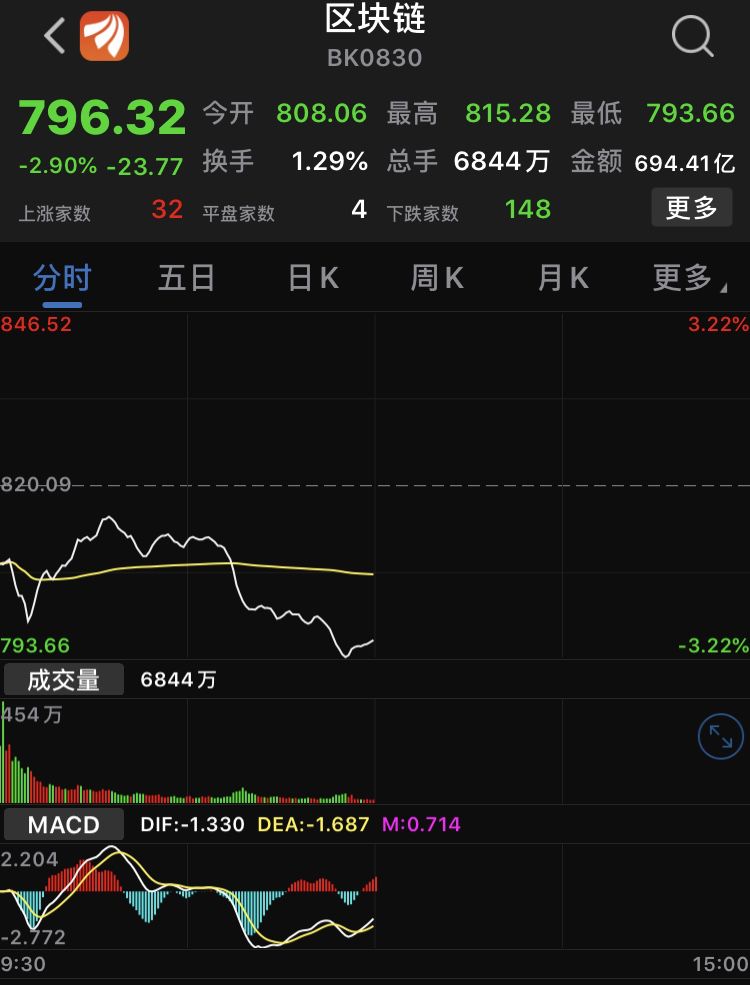 上午一开盘,区块链概念股就出现鲜明的分化。东财区块链板块显著低开1.47%,随后跌幅持续扩大至上午收盘时的2.9%。