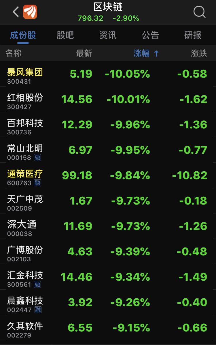 其中,暴风集团一字跌停,跌幅10.05%,成为区块链板块中跌幅最大的个股。除此之外,红相股份、百邦科技、常山北明、京蓝科技等多家公司上午跌停。
