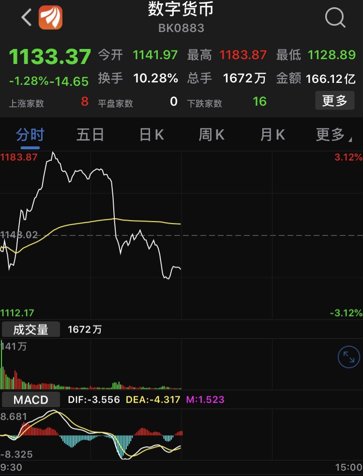但随着上证指数的下跌,数字货币板块也开始下跌,截至上午收盘,数字货币板块跌幅达1.28%。其中,个股跌多涨少,截至上午收盘,数字货币板块中共有8只个股上涨,16只个股下跌。