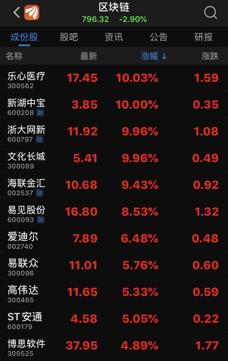上午,区块链板块中有一大批涨停股先后打开涨停。高伟达、海联金汇、易见股份、四方金创、易联众等公司打开涨停。仅乐心医疗、新湖中宝、浙大网新、文化长城、ST安通封住涨停,板块内184只个股中,仅32只上涨。