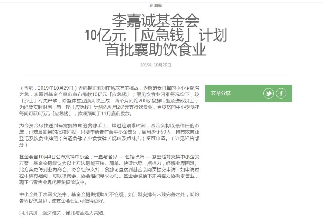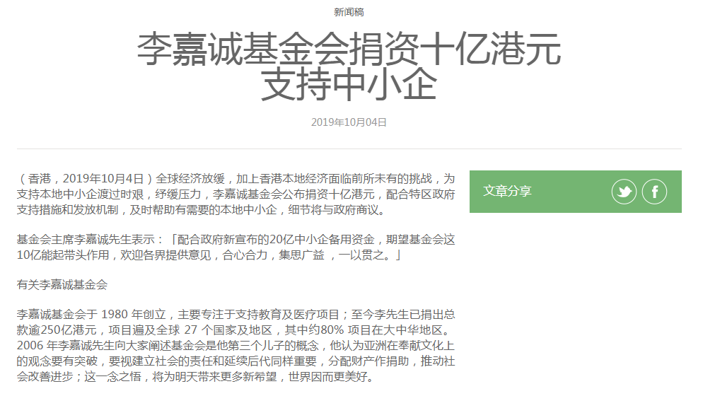 其实早在10月4日,李嘉诚基金会官网就已显示,因全球经济放缓,加上香港本地经济面临前所未有的挑战,为支持本地中小企渡过时艰,纾缓压力,李嘉诚基金会公布捐资十亿港元,配合特区政府支持措施和发放机制,及时帮助有需要的本地中小企,细节将与政府商议。