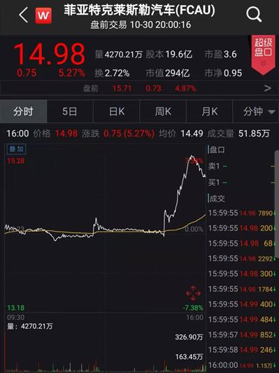受此利好,截至基金君18点50分许截图,菲亚特克莱斯勒盘前上涨4.87%,Wind统计数据显示,该公司周二及周三两个交易日已经累计上涨超10%。