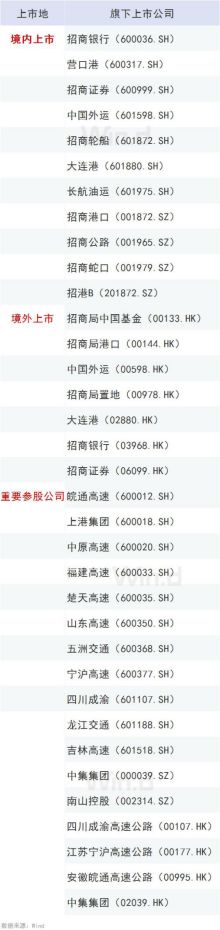 而招商局集团旗下上市公司则相对更多,其中境内上市11家,包括招商银行、招商证券、招商公路、招商蛇口等;境外上市7家,包括招商局港口、中国外运、招商局置地等。另外,还包括17家重要参股公司。