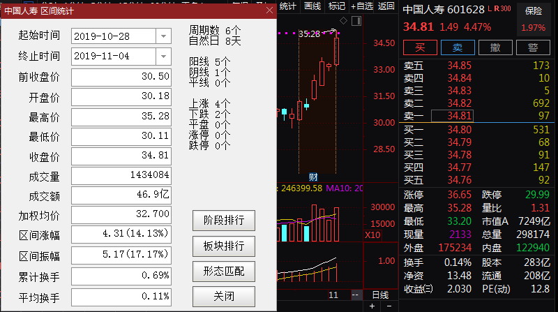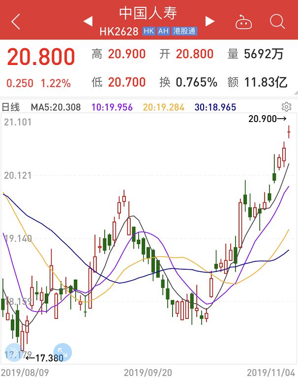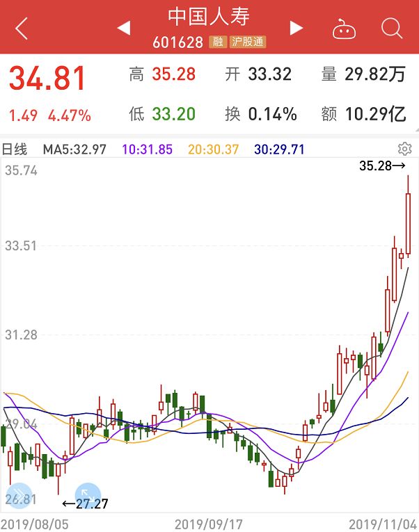 11月4日,中国人寿盘中涨幅一度超过6%,最终收涨4.47%,收于每股34.81元,创2015年7月以来的逾4年新高,A+H市值已超过8600亿元。值得注意的是,从上周一(10月28日)开始,中国人寿行情突然启动,至今短短6天时间,股价涨幅超过14%,市值飙涨近1000亿。