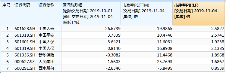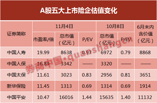 10月份以来,中国人寿的涨幅尤其明显。10月份,中国人寿A股上涨21.72%,11月两个交易日又涨了4.07%,其A股市值已经来到7249亿元。反观其他保险股,则与中国人寿相去甚远。