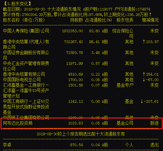 作为中国最大的机构投资者,中国人寿的总投资资产规模达3.4万亿元。也许是中国人寿的投资能力获得了认可,在中国人寿三季报当中,可以看到一家新进的基金,那就是阿布达比投资局(AbuDhabi Investment Authority, ADIA)——持股1023.83万股,持股占流通股比例约为0.05%。