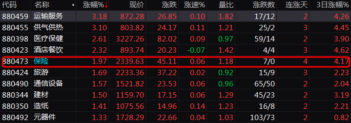 中国人寿上涨比较亮眼,而保险股整体也有不错涨幅。11月4日,保险板块整体上涨1.97%,为涨幅第五的板块。值得一提的是,保险股连涨4天,成为各板块中连涨天数最多的。保险股的“3日涨幅”4.17%,也是3天涨幅居前的板块。