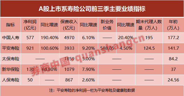今年前三季度,中国人寿归母净利润为577.02亿元,同比增长190.4%,增速在上市险企中居首。
