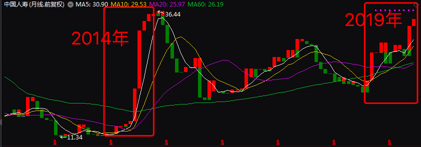 一般来说,公司股价表现,也会跟着业绩和管理层更换而动。以中国人寿来说,上一届管理层变化发生在2014年初,当年股价走出了一波上涨行情。如今2018年底的换届,也让其股价在2019年收获了上好表现。