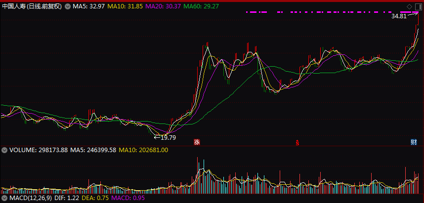 在保险行业里,中国人寿最近的表现可谓是一枝独秀。截至今日收盘,其A股股价已经来到了34.81元,创近四年新高。