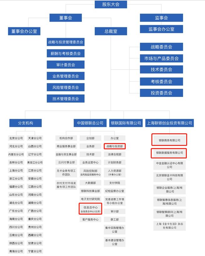 中国银联官网披露的组织架构显示,董事会、监事会之外,中国银联总裁室日常管理银联各地分公司、中国银联总公司(下辖银联信息总中心等)、银联国际有限公司、上海联银创业投资投资有限公司(下辖银联商务、银联数据服务有限公司等)。