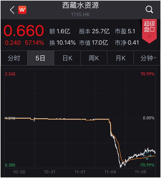 西藏水资源有限公司(001115.HK)继昨日盘中跳水暴跌67%后,今日强势回弹,收涨57.14%,报0.66港元,盘中最高涨幅76.19%,最高价达0.74港元,现总市值17亿元。