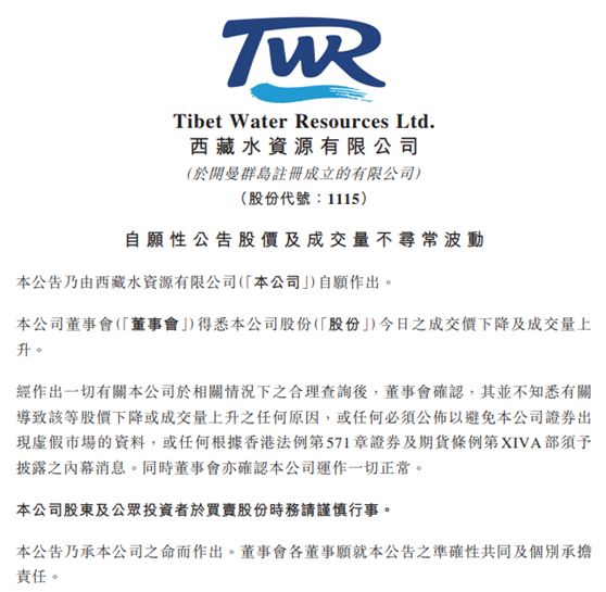 昨日暴跌后,西藏水资源董事会迅速回应,发表公告称,公司董事会得悉公司股份今日成交价下降及成交量上升。经作出一切有关公司于相关情况下合理查询后,董事会确认,其并不知悉有关导致该等股价下降或成交量上升任何原因,或任何必须公布以避免公司证券出现虚假市场的资料,或任何根据香港法例第571章证券及期货条例第XIVA部须予披露内幕消息。同时董事会亦确认公司运作一切正常。