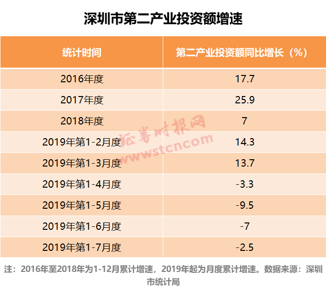 记者在深圳市政府在线官网上查看数据发现,2019年1-7月,深圳固定资产投资中,第二产业投资增速放缓,甚至继2016年下半年之后再次出现负增长,而作为第二产业最主要的构成,深圳的规模以上工业增加值的增速也在今年出现放缓。