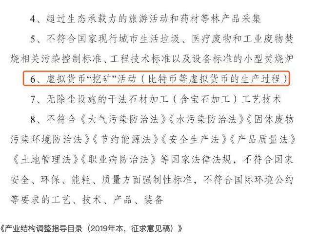 2019年4月8日,在《产业结构调整指导目录(2019年本,征求意见稿)》,虚拟货币“挖矿”活动被列入淘汰类产业,属于“落后生产工艺装备”类目。该指导目录还显示,未标淘汰期限或淘汰计划的条目为国家产业政策已明令淘汰或立即淘汰。而虚拟货币“挖矿”活动这一条没有标上“淘汰期限或淘汰计划”。