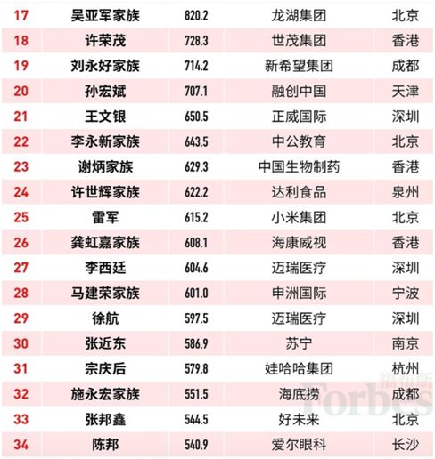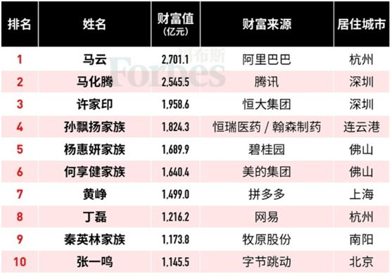 腾讯CEO马化腾排名第2位,身家为2545.5亿元;恒大集团董事局主席许家印排名仍为第3位,身家为1958.6亿元。马化腾和许家印的排名与去年一致。