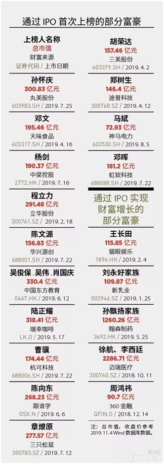此外,据统计,2019年的福布斯中国400富豪榜中,有16位所在的14家公司于过去12个月上市,且这14家公司的总市值超过3000亿元人民币;其中七家在上海交易所上市,三家深圳交易所上市,香港与美国股票市场上市的各两家,内地IPO仍然占大多数。