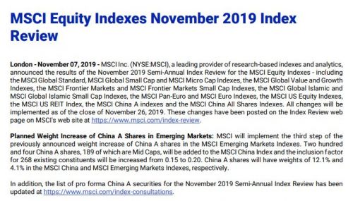 11月8日凌晨,MSCI宣布将把指数中的所有中国大盘A股纳入因子从15%增加至20%,同时将中国中盘A股一次性以20%的纳入因子纳入MSCI指数,11月26日收盘后生效。这也是年初至今最大一次MSCI扩容。