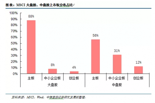 据中信建投分析,从上市板分布看,大盘股和中盘股相比,前者中主板的比重远高于后者,而后者创业板比重则远高于前者。按照11月底的MSCI纳入方案,纳入因子从15%上升到20%,中盘股被纳入且纳入因子一次性提升到20%。从成分分布分析,创业板是在MSCI纳入过程中边际变化最大的上市板。