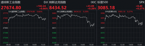 美股再创历史新高。道指涨0.66%,报27674.8点;标普500涨0.27%,报3085.18点;纳指涨0.28%,报8434.52点。