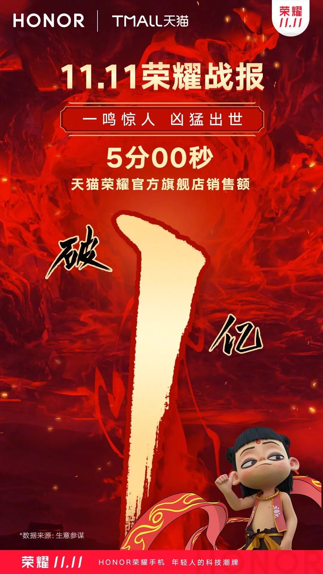 在京东平台上,荣耀包揽了21个省份的品牌销量冠军,在天猫平台上仅5分钟官方旗舰店销售额破亿。