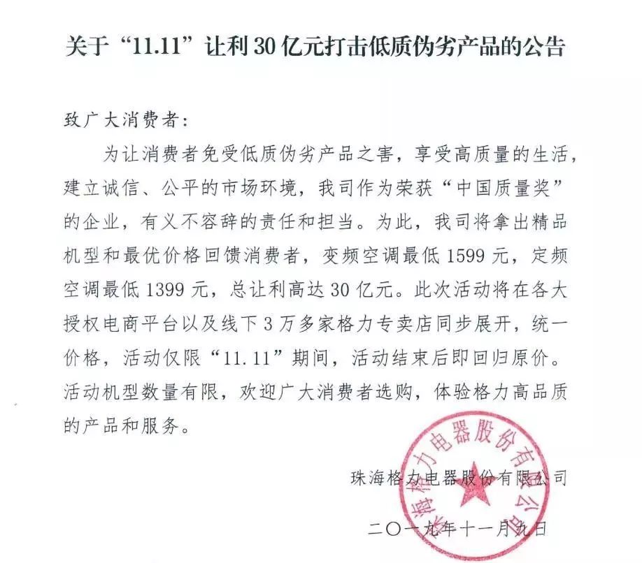 紧接着11月10日,格力电器官微公告,格力电器“11.11”期间让利30亿元,打击低质伪劣产品,变频空调、定频空调最低价分别至1599、1399元。