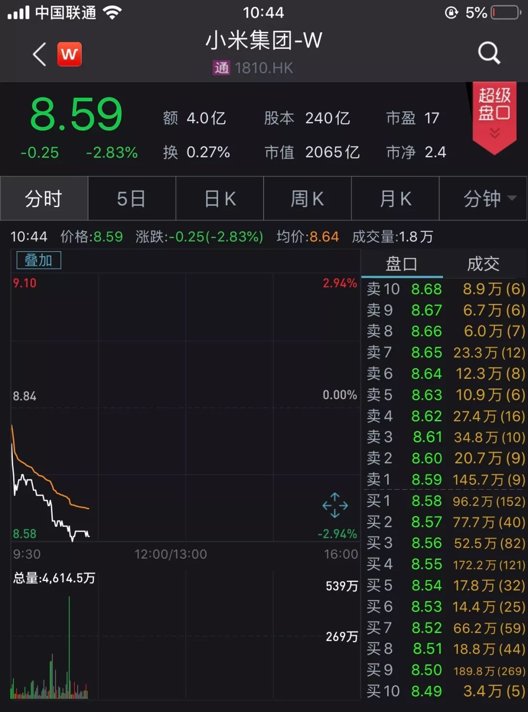 港股小米集团今日低开低走,跌幅近3%;联想集团跌幅较大,跌超5%。