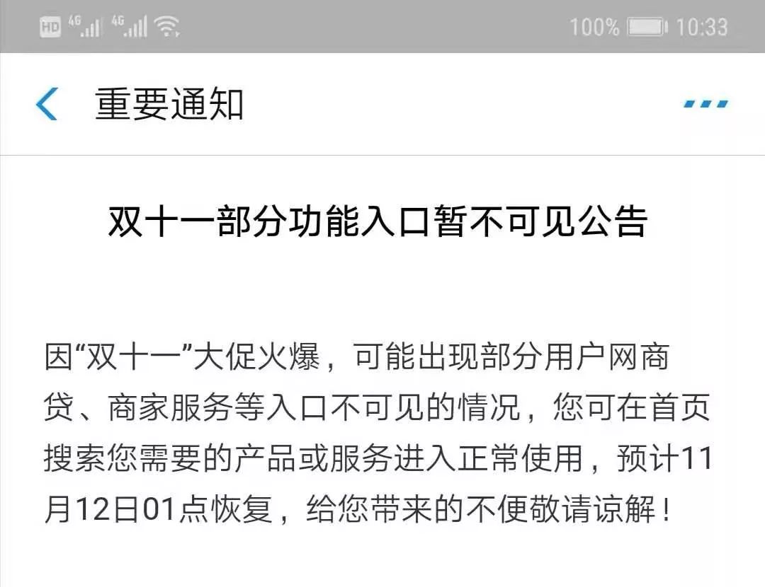 这届双十一太火爆,支付宝也快受不了了,今天支付宝APP发布公告,因“双十一”大促火爆,可能出现部分用户网商货、商家服务等入口不可见的情况,您可在首页搜索您需要的产品或服务进入正常使用,预计11月12日01点恢复。