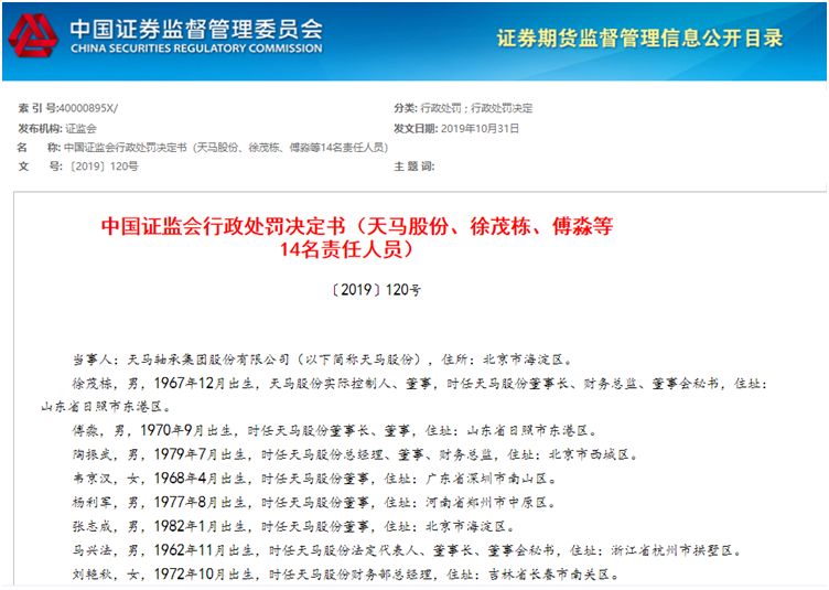 证监会网站近日正式对上市公司天马股份(注:下文部分地方简称*ST天马,股票代码:002122)及实控人徐茂栋开出罚单,与其一同受罚的还有公司时任总经理等多位董监高。