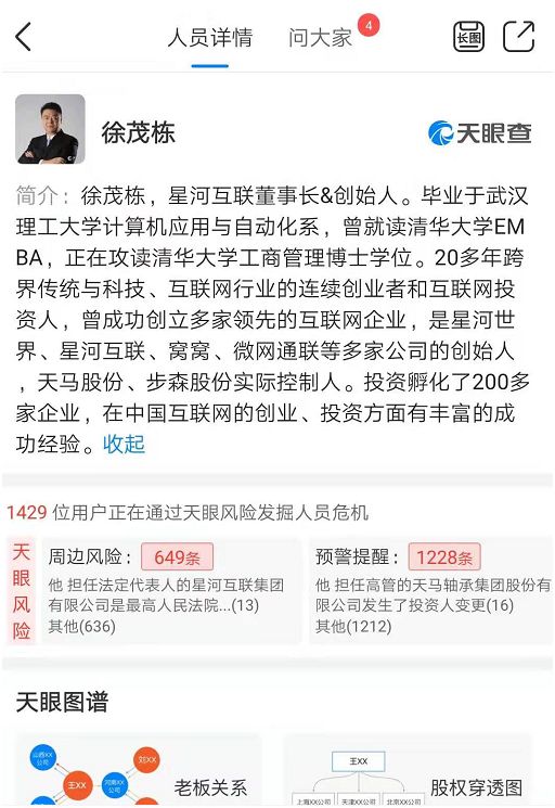 天眼查的资料显示,徐茂栋是星河互联的董事长和创始人,号称是跨界传统行业与互联网的连续创业者。