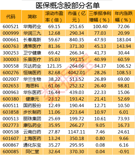 数据宝统计显示,A股的医保概念股共97只,然而盈利情况两极分化,盈利个股62只,前三季度净利增幅翻倍以上的有7只,同时跌幅超50%的有9只。估值低于20倍的有32只,市值超千亿的有恒瑞医药和云南白药。
