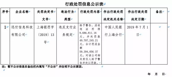根据今年7月央行行政处罚信息公示表,环迅因违反支付业务规定,被央行上海分行给予警告,没收违法所得合计约968万元,并处罚款4970万,合计罚没金额 5939万。