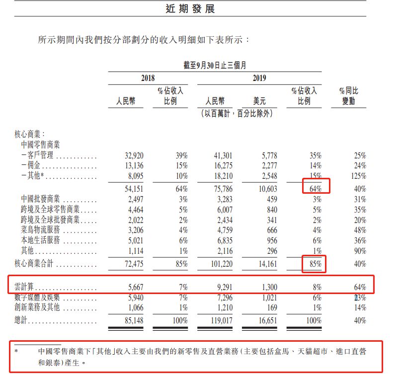 从营收构成来看,作为阿里巴巴传统贡献营收的主力军,以淘宝、天猫、银泰、盒马等直营业务在内的中国商业零售版块本财季实现营收同比增长40%,至757.86亿元,占总营收的比例为64%;如果再加上阿里巴巴批发业务,以及菜鸟物流、本地生活业务在内,核心商业收入在总营收中的占比将达到85%。此外,阿里云智能版块业绩增长最快,当季实现营业收入92.91亿元,比上年同期增长36.24亿元,增速达到64%。