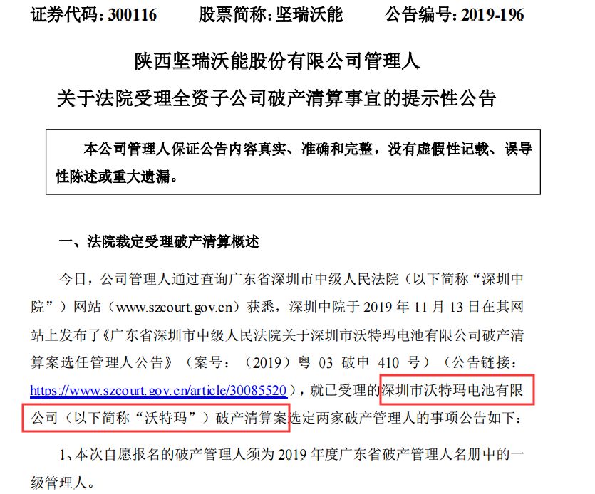 昨晚,沃特玛的上市主体即母公司坚瑞沃能发布公告称,深圳市中级人民法院于2019年11月7日裁定受理黄子廷申请深圳市沃特玛电池有限公司破产清算一案。