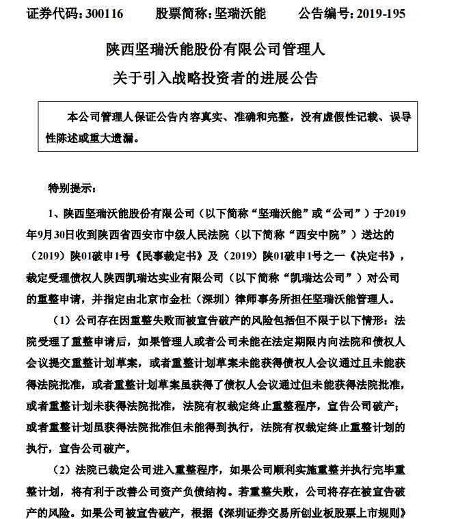 同时,坚瑞沃能还提示风险,目前依然面临较大的偿债风险,若债务重组工作无法顺利完成,对坚瑞沃能本次引入战略投资者事项产生不利影响,有可能导致该事项最终无法实施。
