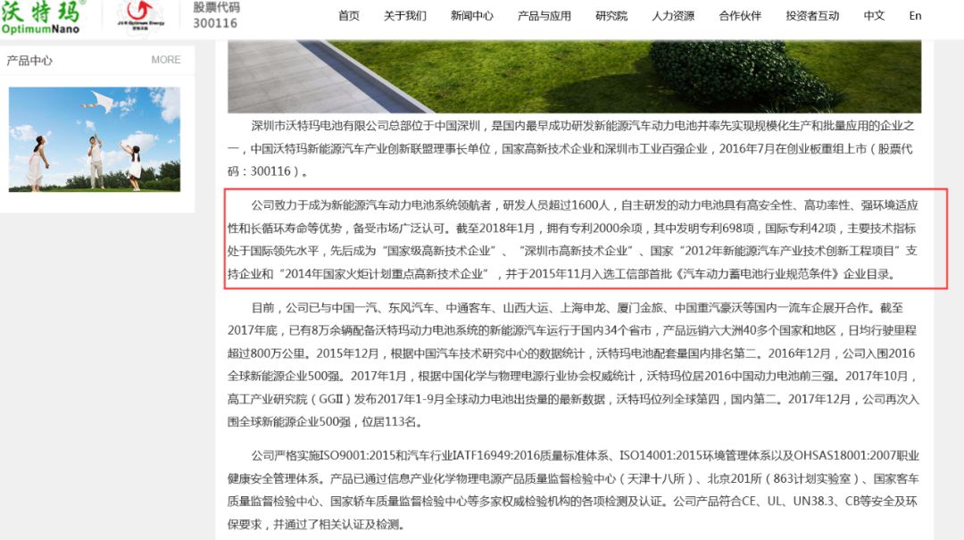 公开资料显示,深圳市沃特玛电池有限公司总部位于中国深圳,是国内最早成功研发新能源汽车动力电池并率先实现规模化生产和批量应用的企业之一,位居中国动力电池前三强,其动力电池在国内25个新能源汽车推广示范城市中已占有约20%的市场份额。