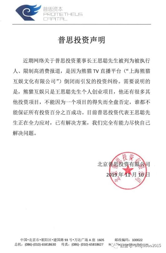 2019年11月11日,普思资本挂出了“出事”后的首份声明,声明中写道“王思聪之所以被列为被执行人、限制高消费报道,是因为熊猫TV倒闭而引发的投资纠纷。”